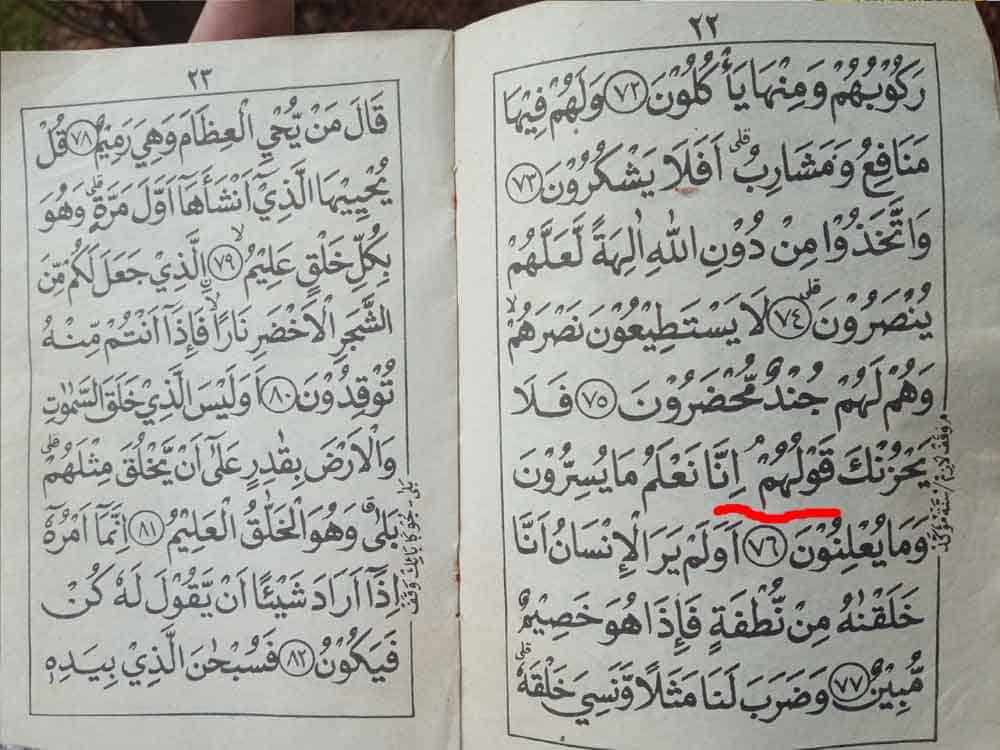 Untuk perbandingan, mari kita lihat ayat ke-76 surat yasin yang ada pada mushaf al-Quran berikut: