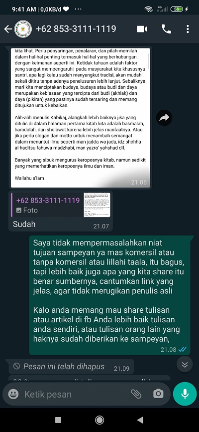Akhirnya saya komentar di postingan tersebut dengan maksud memberitahu bahwa saya adalah penulis asli dari artikel tersebut dan menunggu iktikad baik dan pertanggung jawaban dari penjiplak ini. Tidak lupa saya cantumkan link menuju artikel asli. Hingga akhirnya saya mencoba untuk menghubungi pemilik halaman fb yang bernama ‘Facebook +6285331111119’ melalui Whatsapp (nomor WA tertera di info halaman fb).