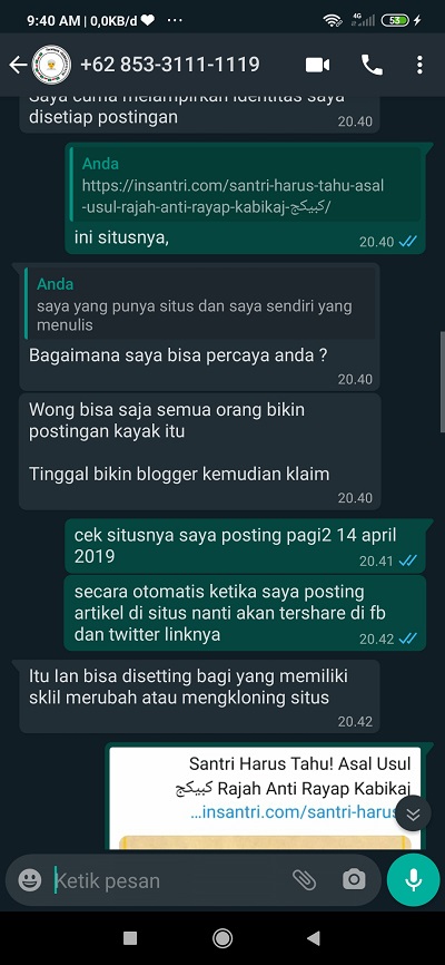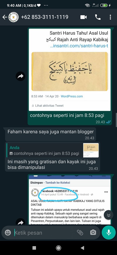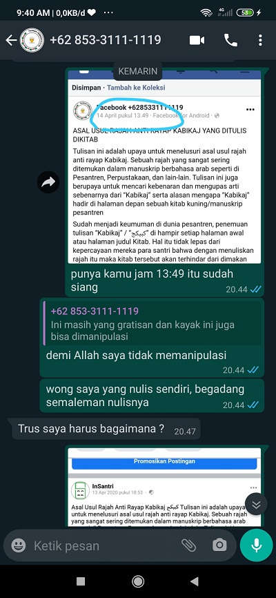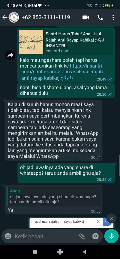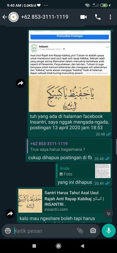 SA: ”tuh yang ada di halaman facebook Insantri. Saya nggak mengada-ada postingan 13 april 2020 jam 18:53” chat saya yang agak ketinggalan, saya tidak tahu kenapa bisa jadi lebih awal tanggalnya di halaman fb saya, mungkin karena malamnya saya ngepost dulu lalu saya edit kemudian di pagi hari (14 april 2020). Jawabannya saya yaitu “cukup dihapus postingan fb”. “yang ini dihapus” saya menandai halaman Fb beliau. “kalo mau ngeshare boleh tapi harus mencantumkan link ke https://insantri.com/santri-harus-tahu-asal-usul-rajah-anti-rayap-kabikaj-%d9%83%d8%a8%d9%8a%d9%83%d8%ac/”. “nanti bisa dishare ulang, asal yang lama dihapus dulu”