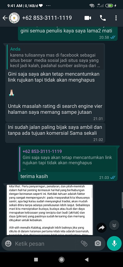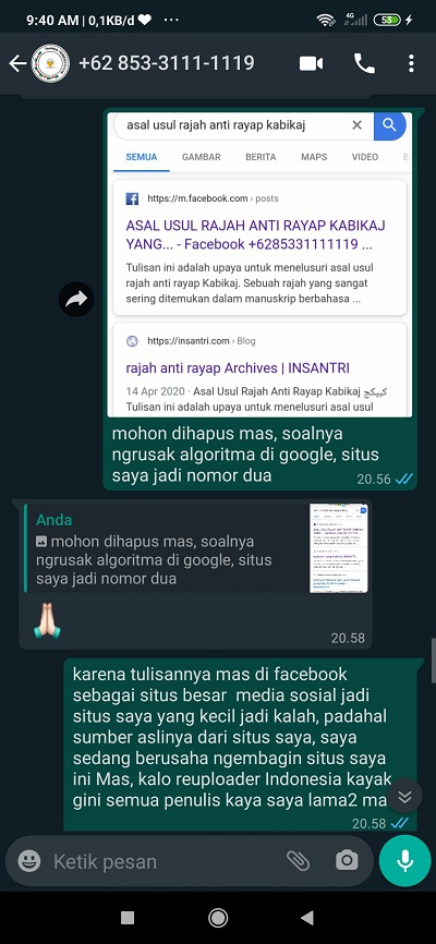 SA: “Assalamu alaikum. Maaf anda sudah ngopas tulisan saya yang berjudul ‘asal usul rajah anti rayap kabikaj’ tanpa memberi credit dan link menuju situs saya, serta seolah-olah tulisan tersebut anda buat sendiri”. Kemudian saya menyertakan screenshot post halaman fb beliau dan link menuju artikel asli situs saya. “Saya tunggu iktikad baiknya dan pertanggung jawabannya”.